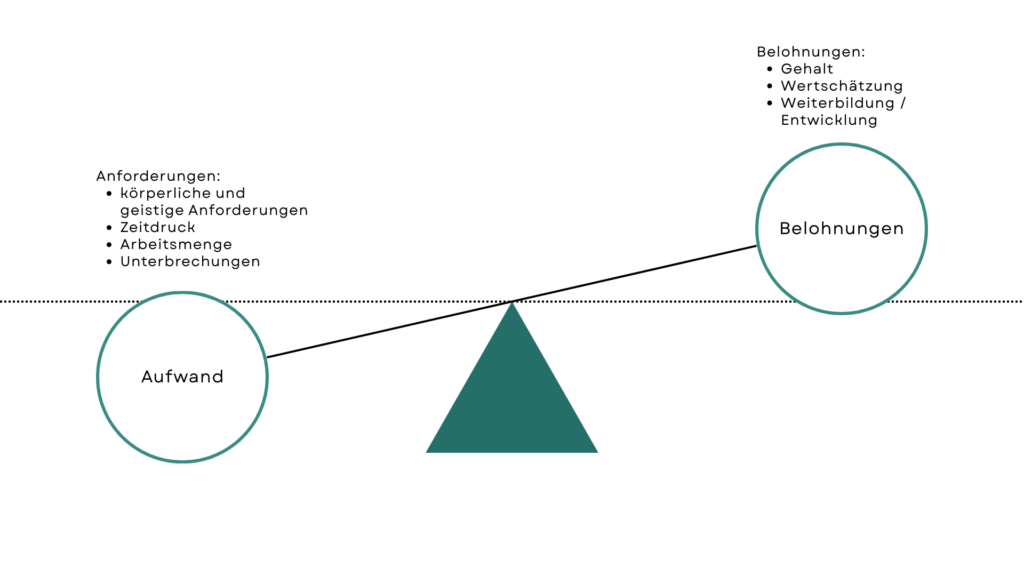 Dieses Modell geht davon aus, dass Gesundheitsrisiken dann entstehen, wenn zwischen dem Aufwand (Effort) und den erhaltenen Belohnungen (Rewards) ein Ungleichgewicht besteht. Besonders negativ belastend sind Situationen mit hohem Einsatz bei gleichzeitig geringer Anerkennung, unzureichender Bezahlung oder fehlender sozialer Wertschätzung. Das ERI-Modell ist somit zentral für das Verständnis von körperlichen, geistigen und emotionalen Belastungen, sozialer Unterstützung, Arbeitsfairness sowie unklaren Rollen und Orientierungsdefiziten.