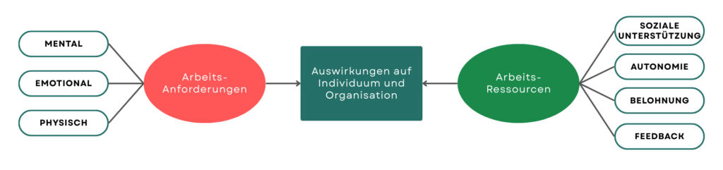 Das JD-R-Modell unterscheidet zwischen Arbeitsanforderungen, die Energie kosten und Belastung erzeugen und Arbeitsressourcen, die motivierend wirken und Beanspruchungsfolgen abpuffern können. Hohe oder ungünstig gestaltete Anforderungen erhöhen das Risiko von Erschöpfung und Burnout, während ausreichend vorhandene Ressourcen (z.B. soziale Unterstützung oder Handlungsspielraum) diesen Effekten entgegenwirken. Relevant ist das Modell insbesondere für das Verständnis des Zusammenspiels von geistigen Anforderungen, sozialer Unterstützung, Informationsmängeln und fehlendem Handlungsspielraum.